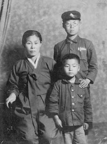 左の写真の裏に、「昭和22年4月30日写す」と 書かれてあった。 昭和22年とは1947年だ。 左が母、玄行春。1900年生 この時47歳になる。 右後ろが仁守兄(15歳)1933年生、 その前が私、仁鳳(6歳)1941年生だ。 韓国へ帰国直前に撮影されたと思われる。 |