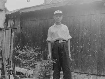 | 自宅の前で。現在もこの家で住んでいる。改装しているが、この時は一階建ての長屋だった。 | |||||