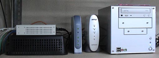 | <ハブ>ここから皆さんのパソコンへ配信される。 | <モデム>光ケーブルのデータはここへ。 | <AirStation> 無線ラン。ランケーブルが届かないところで使う。 |