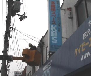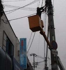 朝から雨、10時から関西電力の工事関係者が配線の工事を始めた。 「まだん」の前にある電柱からケーブルを「まだん」を通って社内に引き込んだ。 えらいおおげさな工事だ。ガードマンも付いて。 |