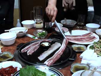 | サンギョップサル、ここのはえらい長い。あとではさみで切ってくれる。 | |||||||||||||