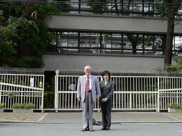 | 総連大阪本部の前で、校友会事務局の金順玉さんと | ||